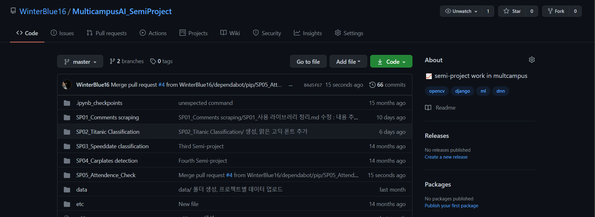 예시로 제 깃허브 저장소를 가져와 봤습니다. 세미프로젝트를 모아놓은 레포지토리입니다.