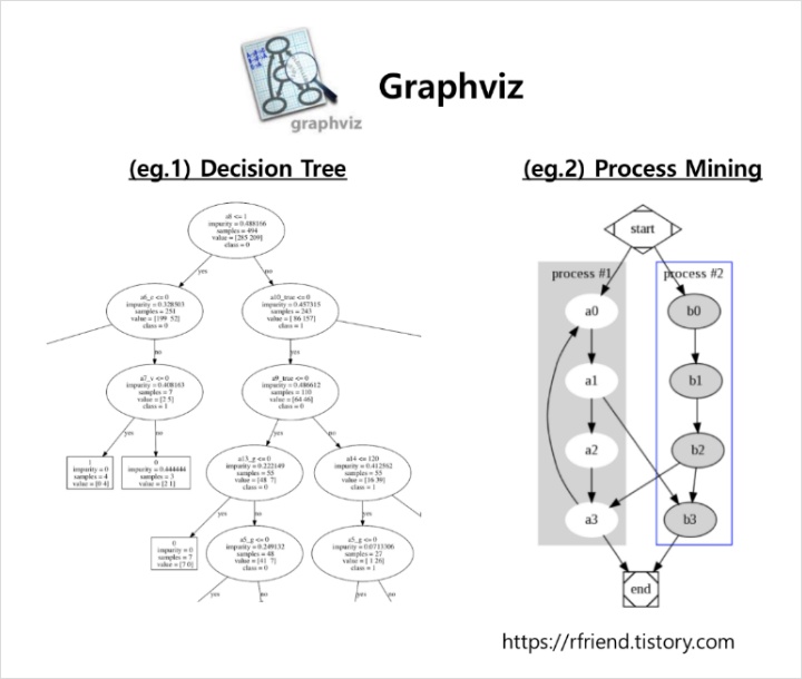Graphviz는 AT&T와 Bell Labs에서 만든 오픈소스 시각화 소프트웨어입니다. Graphviz는 구조화된 정보를 추상화된 그래프나 네트워크 형태의 다이어그램으로 제시를 해줍니다. 가령, 기계학습의 Decision T