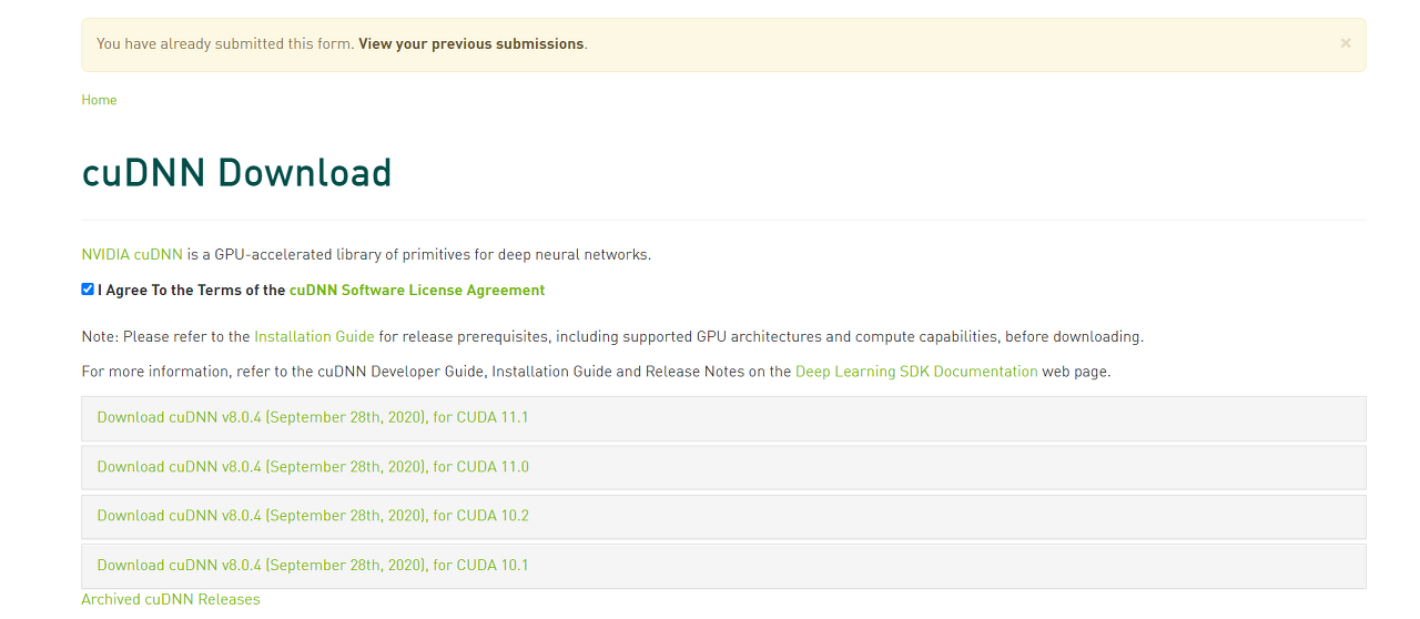 Archived cuDNN Releases를 클릭하면 8.0.4 이하 버전도 모두 볼 수 있다. 물론 다운로드도 가능하다. cuDNN 버전마다 옆에 호환되는 CUDA 버전을 확인할 수 있으니 참고하면 된다. 원래는 cuDNN 8.0.3 버전을 받아 설치 시도해보았으나 에러가 발생하여 cuDNN 7.6.5 버전을 내려받아 다시 설치를 진행하였다.