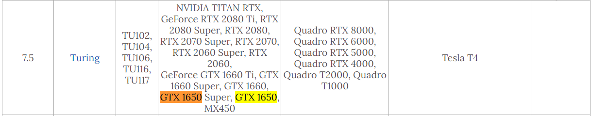 위 페이지의 GPUs Supported 항목에서 GPU 별 Compute Capability와 그에 맞는 CUDA 버전을 확인할 수 있습니다.